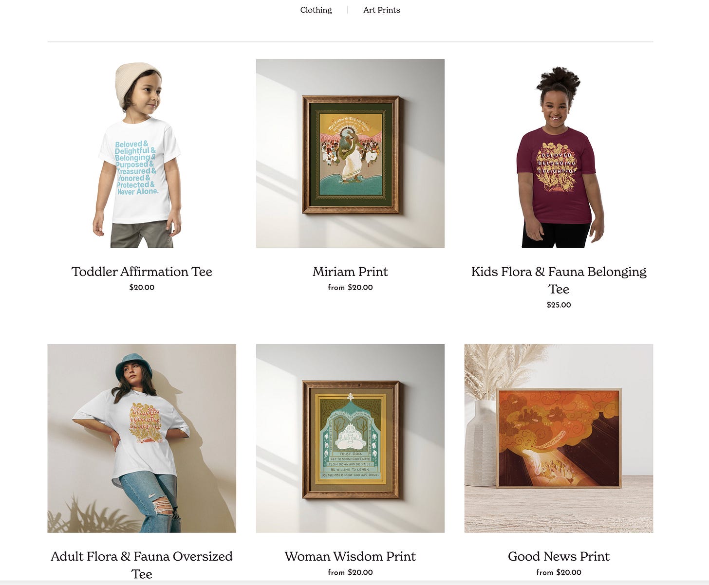 We have seventeen illustrations, plus some BoB-inspired clothing items. The art prints were selected based on your feedback (certain illustrations just don’t scale well for prints, so if we didn’t honor your request, that’s probably why!) and the clothing references the book’s messaging and/or includes some new designs from Rachel!